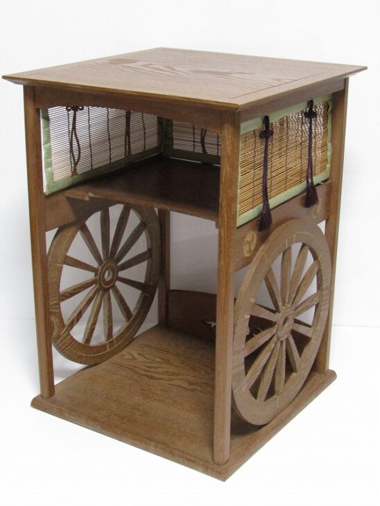 御幸棚は、桑材の四本柱の二重棚で、天板と地板は四方、中板は手前を丸く刳り、両側に大きな車輪を付け、車輪の押え板に巴彫を入れ、上段三方に御簾をかけ、向うに葵の透しのある腰板が嵌った小棚です。