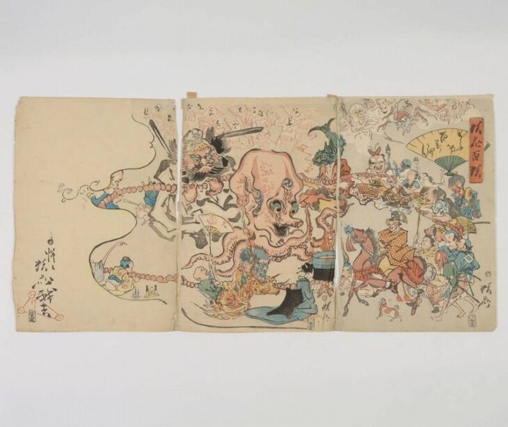 暁斎が2歳の頃に家族と一緒に江戸に移り住み、7歳の頃には浮世絵師・歌川国芳に入門し、絵の基礎から技法を学びました。国芳は人を押さえつけたり、組み伏せたり、あるいは投げ飛ばし、投げ飛ばされる様々な形態、動きをよく観察してそれを表現するように教えていました。そのため、暁斎はどこかで取っ組み合いの喧嘩をしていないかと街中を探し歩いていました。また、神田川で拾った生首を写生して周りの人々を驚かせたこともありました。